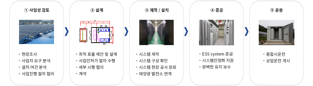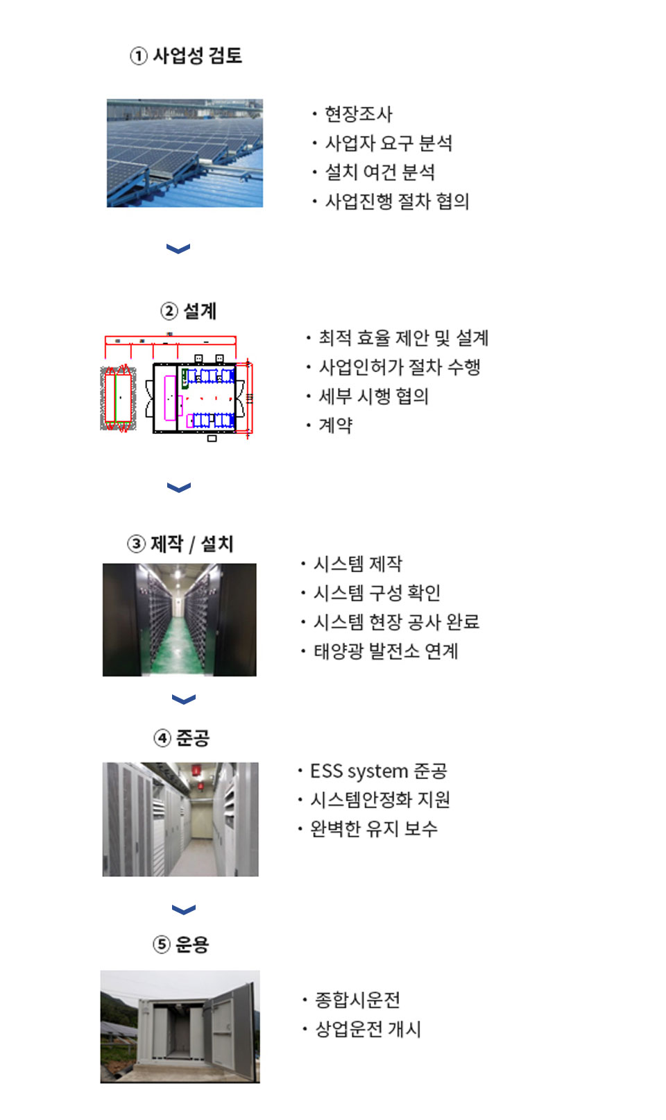 | 사업성분석(허가 신청) | 디자인(구조 설계) | 설치/시공(표준 준수) | 준공(안전 우선) |